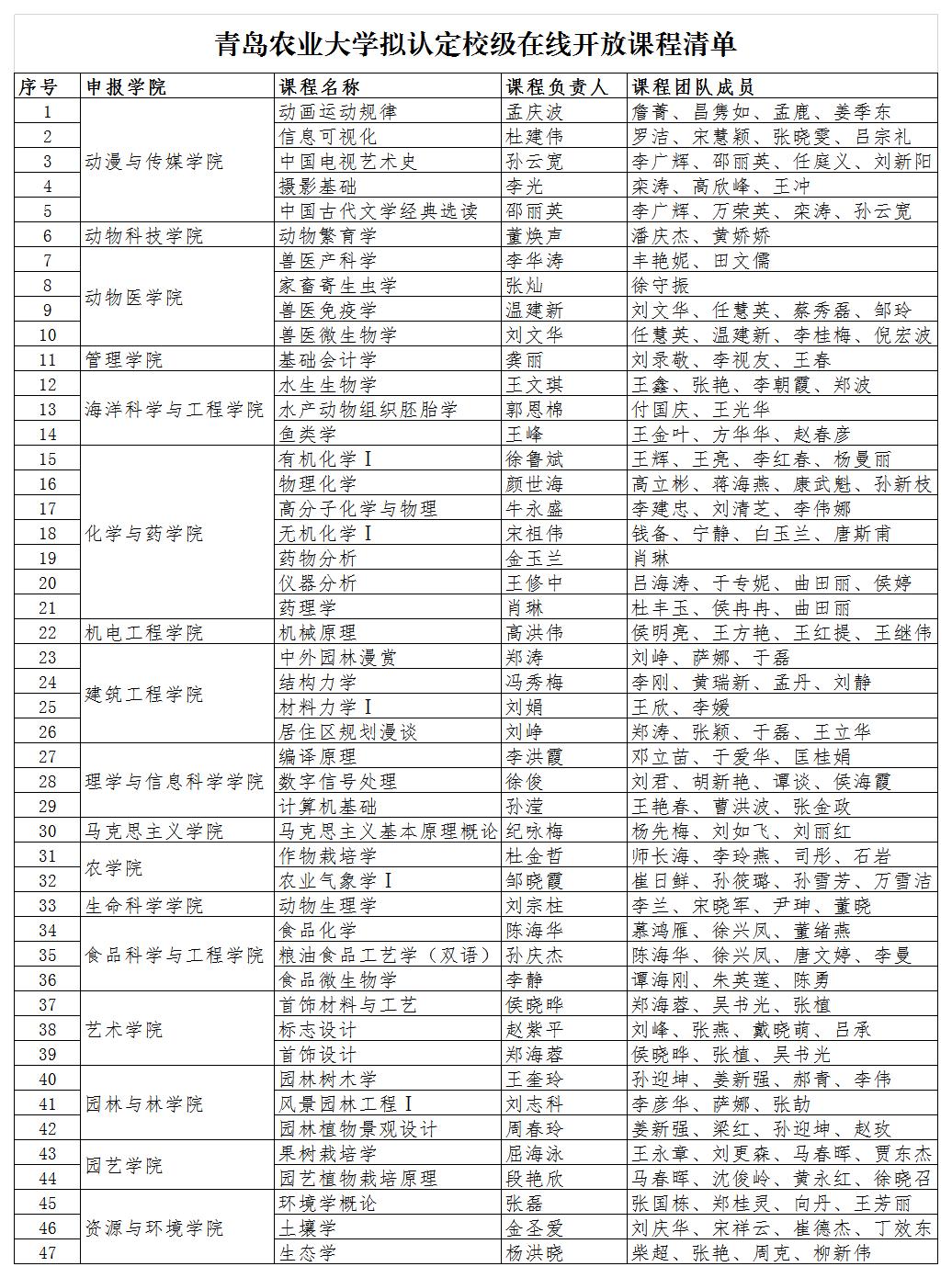根据《青岛农业大学在线开放课程建设与应用管理办法》(青农大校字〔2018〕8号)要求,按照《青岛农业大学在线开放课程验收认定指导标准》对各课程组提交的《校级在线开放课程建设结题验收报告》、课程内容及实际使用和运行情况进行验收,对认定合格的在线开放课程授予“校级在线开放课程”称号,现将认定合格课程予以公示。